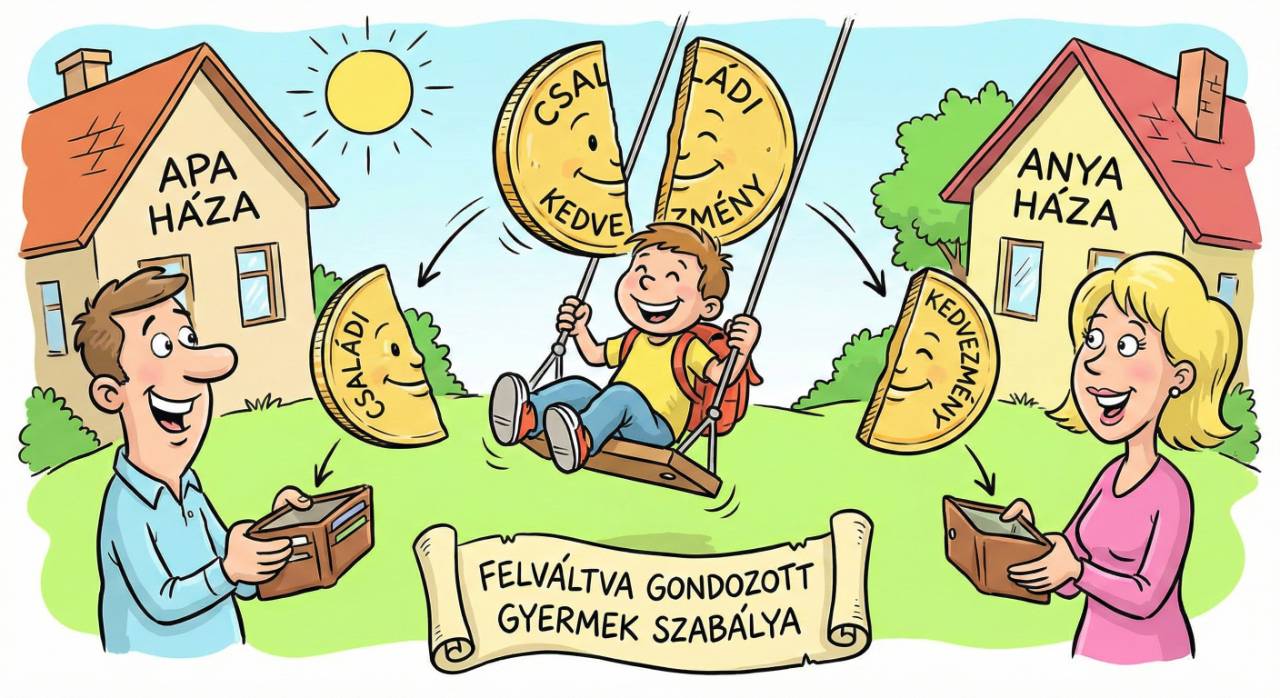 Tehát: ebben a speciális felváltva gondozott helyzetben nincs klasszikus „közös érvényesítés” a két szülő között, hanem a törvény automatikusan fele-fele arányú jogosultságot rendel hozzájuk.